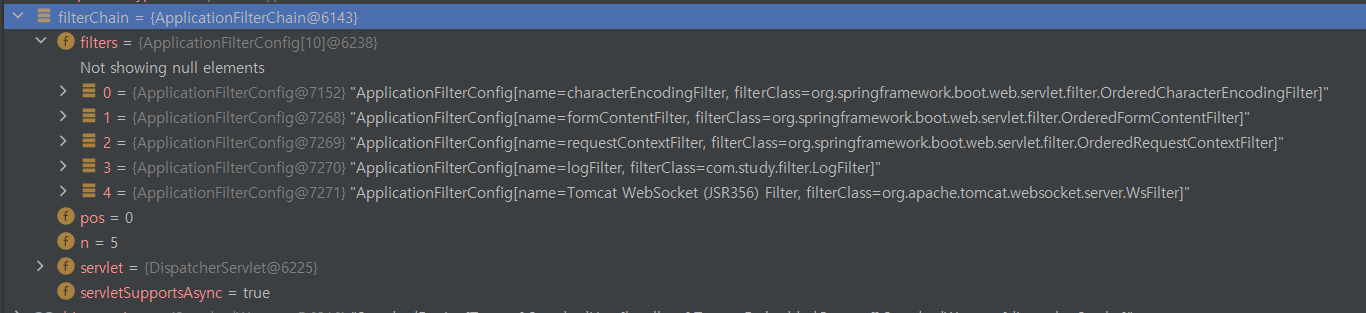 내부적으로는 internalDoFilter메소드에서 위의 filters배열을 인덱스를 가지고 doFilter메소드를 실행한다.