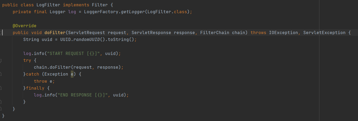 다음은 모든 요청의 시작과 끝에 log를 남기는 필터의 예다.