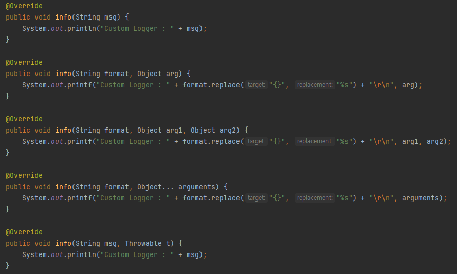 Logger 인터페이스를 구현해야해서, 오버라이드 메서드들이 많다. 여기선 편의상 Systme.out의 메서드들을 사용해서 구현하도록 하겠다.