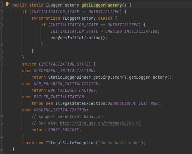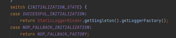 초기화가 성공하면, case SUCCESSFULL_INITIALIZATION로 넘어가는데, StaticLoggerBinder.getSingleton().getLoggerFactory() 이 코드는 slf4j 라이브러리에 없는 코드이다.